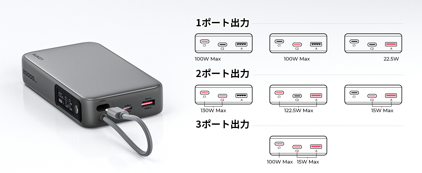 USB-Cケーブル +USB-A出力:100W+22.5W(130W MAX)