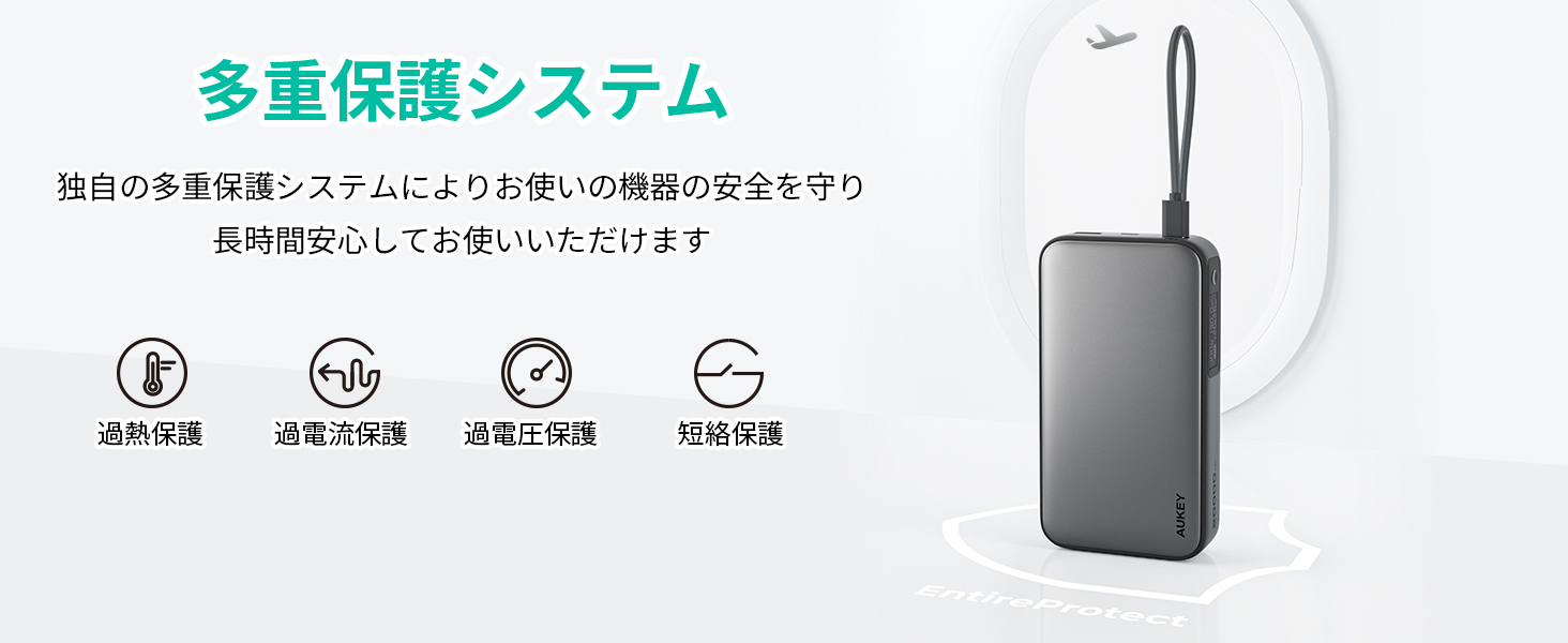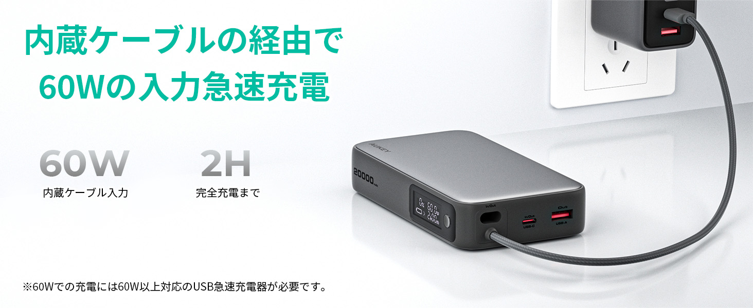 【バッテリー本体にも急速充電】一体型ケーブルは出力だけでなく、入力も最大65Wに対応し、約2時間でバッテリー本体に急速充電が可能です。 ※65W出力のUSB急速充電器を使用して充電した場合(Aukey調べ)