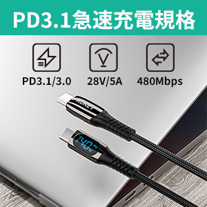【安全な急速充電・高速データ転送が可能】USB PD (Power Delivery)による最大140W (28V/5A)の急速充電に対応しています。Type-C端子搭載のパソコン、スマートフォン、タブレット、充電器やゲーム機器など、さまざまなUSB-C機器の充電に最適です。内蔵のスマートチップ eMarkerが、過充電や発熱を防止し接続機器のバッテリーを保護し、安定した高速充電を提供します。また、最大480Mbpsの高速データ転送が可能です。大容量のファイル・写真・音楽データなども、短時間で転送完了します。