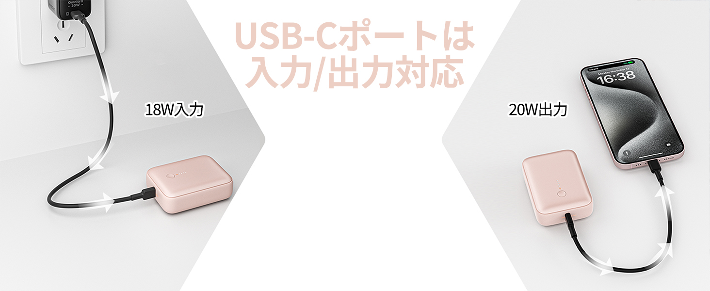 【PD入力/出力対応】USB-Cポートは入力・出力どちらもPD充電に対応し従来規格(5W出力)の約3倍の速さで充電が可能。スマートフォンなどの機器への充電時はもちろん、モバイルバッテリー本体の充電時にも急速充電ができるのでフル充電までの待ち時間が短縮できます。