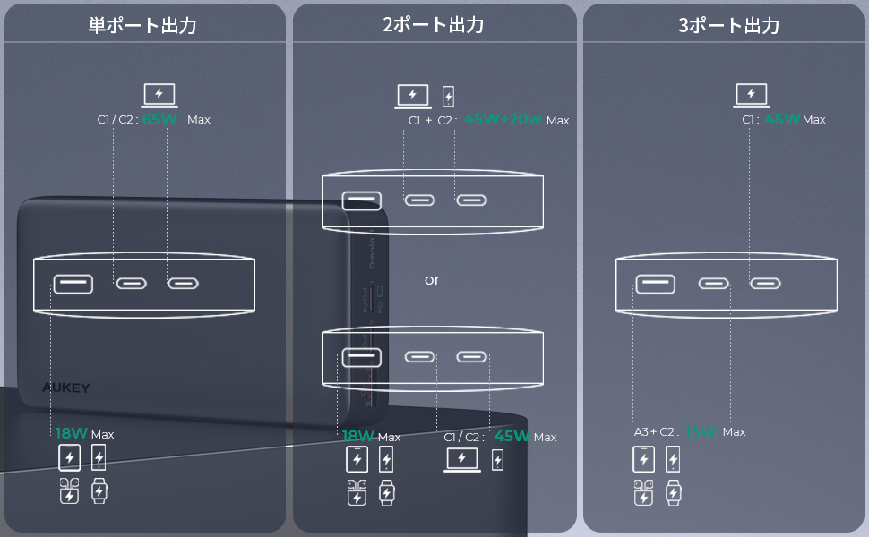 USB-C1+(USB-C2+USB-A): 45W+15W