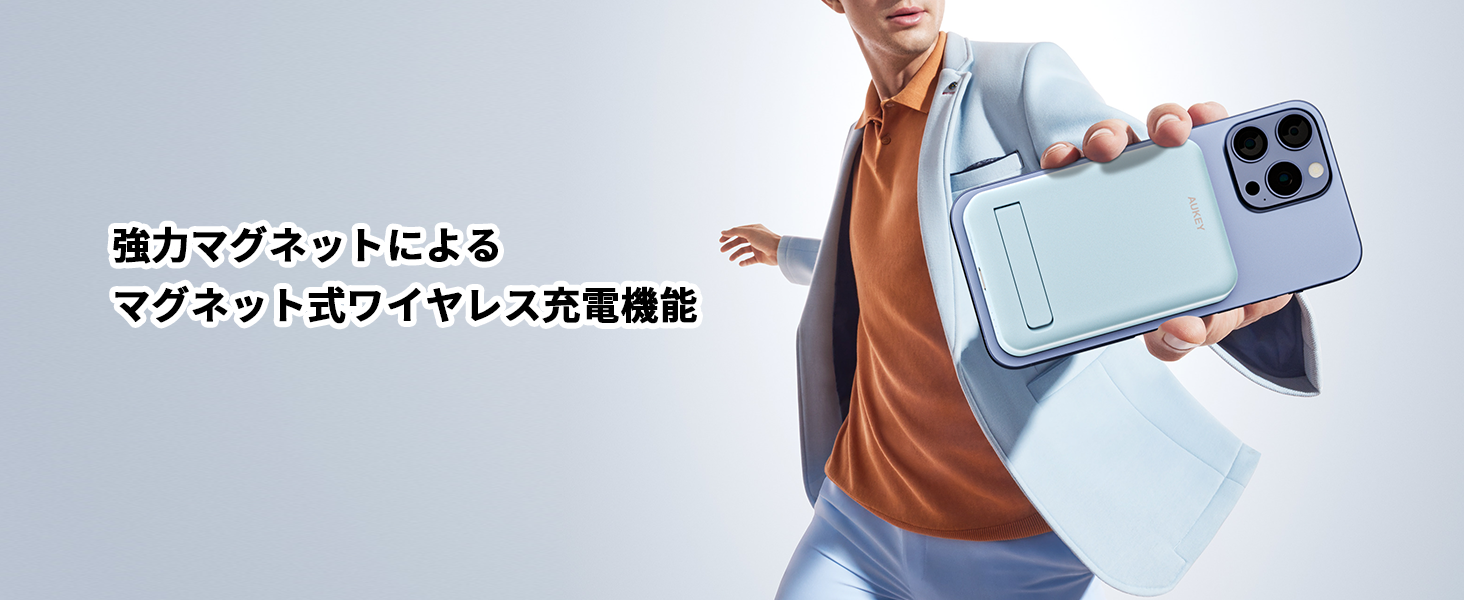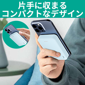 安心の10000mAhの大容量モバイルバッテリーにワイヤレス充電機能を搭載。ワイヤレス充電に対応したさまざまな機器に完全コードレスでの充電が可能です。MagSafeとの互換性があり、MagSafe搭載iPhoneに磁石の力でピタッとくっつきます。折りたたみスタンドを使用すればマグネット吸着で充電しながら動画鑑賞などが快適に楽しめます!ブラック・ホワイト・ブルーの3カラーからお好みのカラーを選べます!