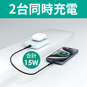 【2台の機器に同時に給電が可能】1つのUSB-C入出力ポートを備えたシンプルな設計。ケーブルを使用した充電とワイヤレス充電を同時に行うことで、2台の機器へ合計最大15Wでの同時充電が可能です。家族や友人と電源をシェアできるので便利です!