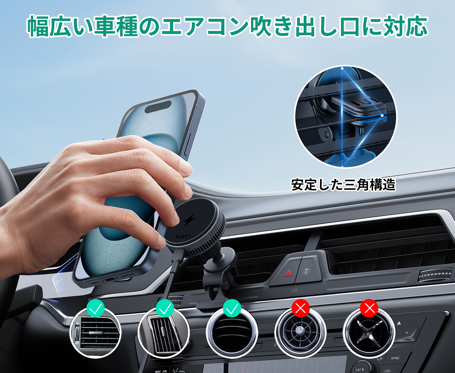 運転中にスマートフォンをカーナビとして長時間の利用中にも機器への高速充電を行いながら効果的に冷却することができます。