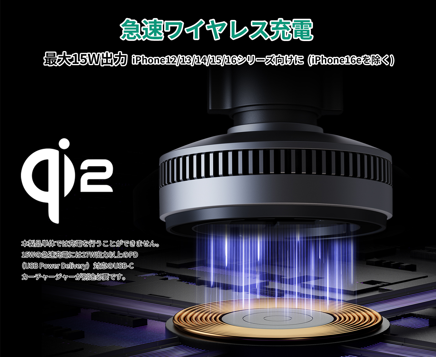 【MagSafe機能に対応】MagSafe機能搭載iPhoneシリーズに強力な磁力で正確な位置にピタッと吸着し、安全に安定したワイヤレス充電をおこなえます。ワイヤレス充電の最新規格Qi2の公式認証を取得しています。従来のQi(7.5W相当)の2倍の最大出力となる15Wの高出力を実現しました。Qi2対応iPhoneシリーズなどの機器の急速充電が可能です。