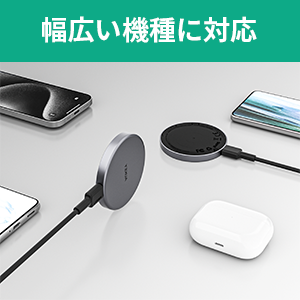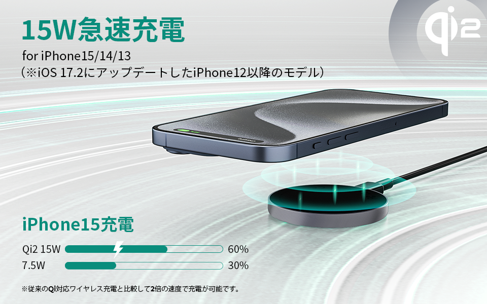 【最新ワイヤレス充電規格Qi2認証を取得】ワイヤレス充電の最新規格Qi2の公式認証を取得しています。従来のQi(7.5W相当)の2倍の最大出力となる15Wの高出力を実現しました。Qi2対応iPhoneシリーズなどの機器の急速ワイヤレス充電が可能です。
